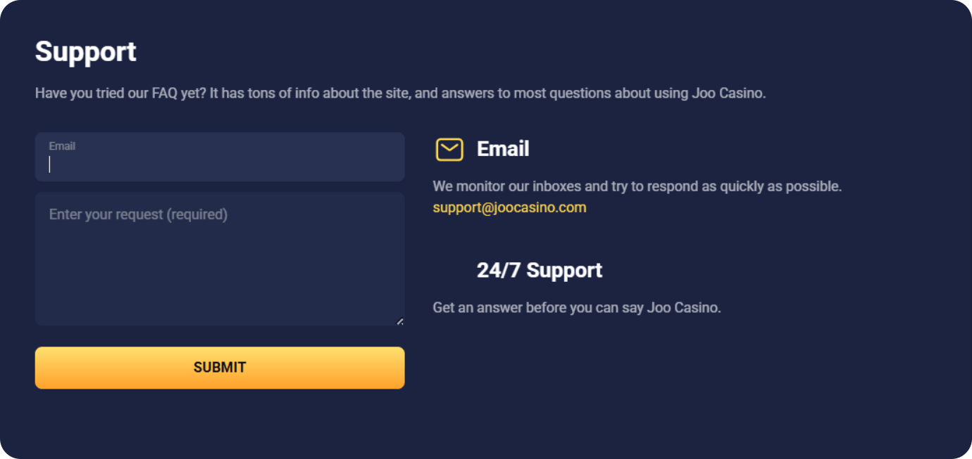 Help is available 24/7 via live chat and email at support@Joocasino.com. The Help/FAQ pages cover verification, bonus rules, and payment timelines. Suspect an account issue? Contact support for a forced reset and security advice.